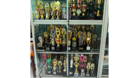 Lemari piala ditempatkan di area strategis, seperti lobi sekolah atau ruang tamu, sehingga dapat dilihat oleh setiap tamu dan warga sekolah. Penataannya rapi dan terawat, dengan pencahayaan yang menonjolkan kilau piala-piala tersebut, menciptakan rasa bangga dan motivasi bagi seluruh siswa.